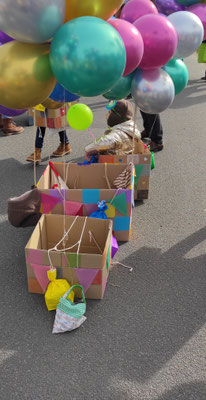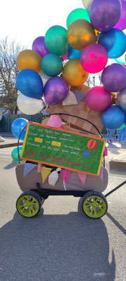 Straßen ziehen. Die Kinder unterstützten uns tatkräftig bei den Vorbereitungen und bemalten und verzierten ihren Ballonkorb selbst. Natürlich kunterbunt. Einzige Herausforderung wurde es am Faschingsdienstag, die gefühlt „1000 Luftballons“ mit Helium zu füllen oder