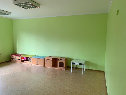 Die Renovierung konnte in dem nun leer geräumten Spielzimmer planmäßig beginnen. Nach dem Tapezieren wurden die Wände grasgrün gestrichen, die Türzargen abgeschliffen und in ein Sonnengelb getaucht. Die Türen erstrahlen jetzt in neuem Eisblau. Sozusagen alles Kunterbunt. Das neue Spielhaus, auch wieder mit Hochebene und mit grünen Elementen, wurde im März geliefert und durch den Hersteller fachgerecht aufgebaut.